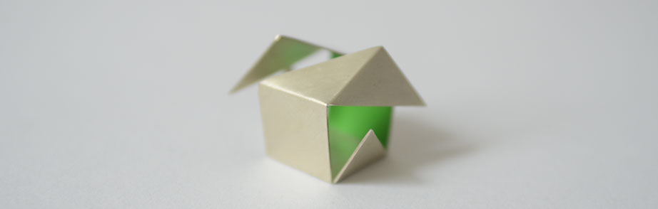 Im Rahmen eines Workshops entstand ein Schmuckobjekt in Form eines aufgebrochenen Würfels. Die diagonal aufgeschnittenen Seiten geben den Blick auf das Innere frei und offenbaren etwas, was man von Außen nicht vermutet hätte. Das Objekt kann für sich stehen oder als Brosche getragen werden.