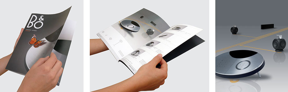 Anschließend erfolgte die Umsetzung der Bilder in ein entsprechendes Kommunikationsmedium. Unter Einbeziehung des Nutzers und der Art des Mediums sowie dessen Verwendungszweck, wurde der Produktkatalog entsprechend gesetzt. Die Farbgebung, Text-Bild-Aufteilung als auch die grafische Gestaltung orientiert sich an der Marke Bang & Olufsen.