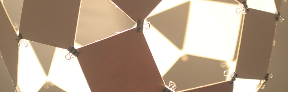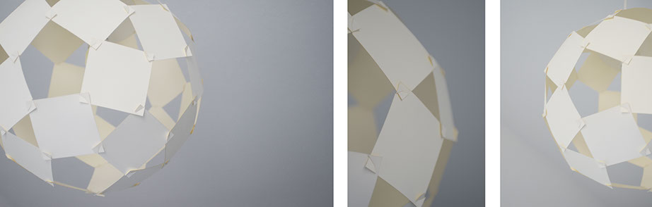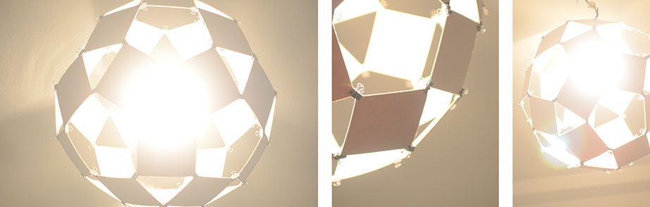 Dieser Entwurf eines Lampenschirms lehnt sich an die Form eines Rhombenikosidodekaeders an. Dieser besteht aus 20 Dreiecken, 30 Quadraten und 12 regelmäßigen Fünfecken. Allein die Quadrate bilden hier die Elemente des Lampenschirms. Zwei mögliche Verbindungsvarianten werden hier gezeigt.