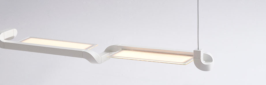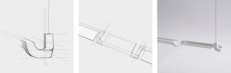 Der Entwurf besteht aus drei unterschiedlichen Einzelteilen, die sich modular zu einer Leuchte zusammenfügen lassen. Sie ist in Länge und Form variabel und passt sich somit ihrer jeweiligen Umgebung sowie ihrem spezifischen Nutzungskontext an. Durch das modulare Bausystem lassen sich einzelne Teile problemlos austauschen.