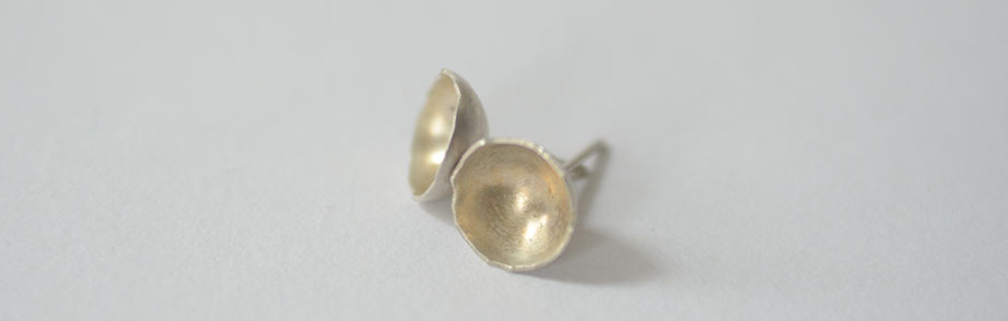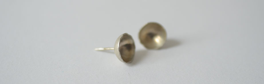 Für diese Ohrstecker wurden zwei kreisrunde Plättchen ausgesägt und in die Form einer Halbschale gebracht. Die Ränder sind unbehandelt und zweigen die raue Seite des Materials, wodurch ein schöner Kontrast entsteht.