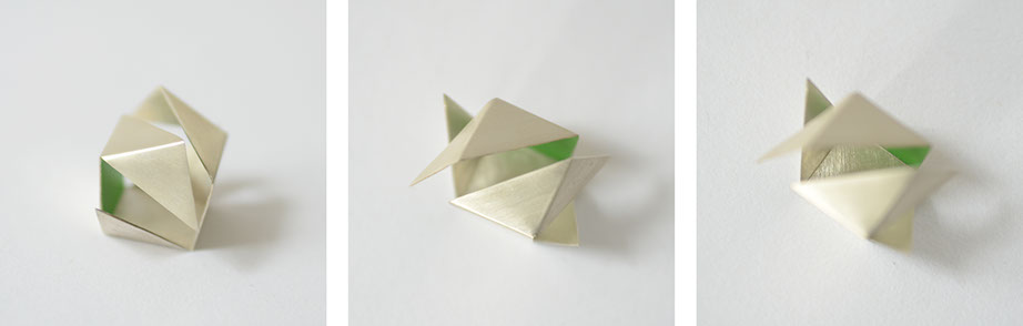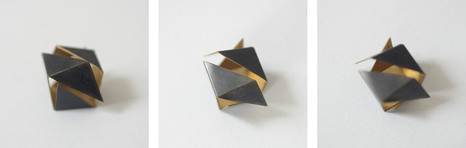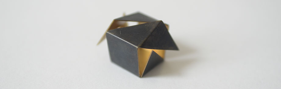 Im Rahmen eines Workshops entstand ein Schmuckobjekt in Form eines aufgebrochenen Würfels. Die diagonal aufgeschnittenen Seiten geben den Blick auf das Innere frei und offenbaren etwas, was man von Außen nicht vermutet hätte. Das Objekt kann für sich stehen oder als Brosche getragen werden.